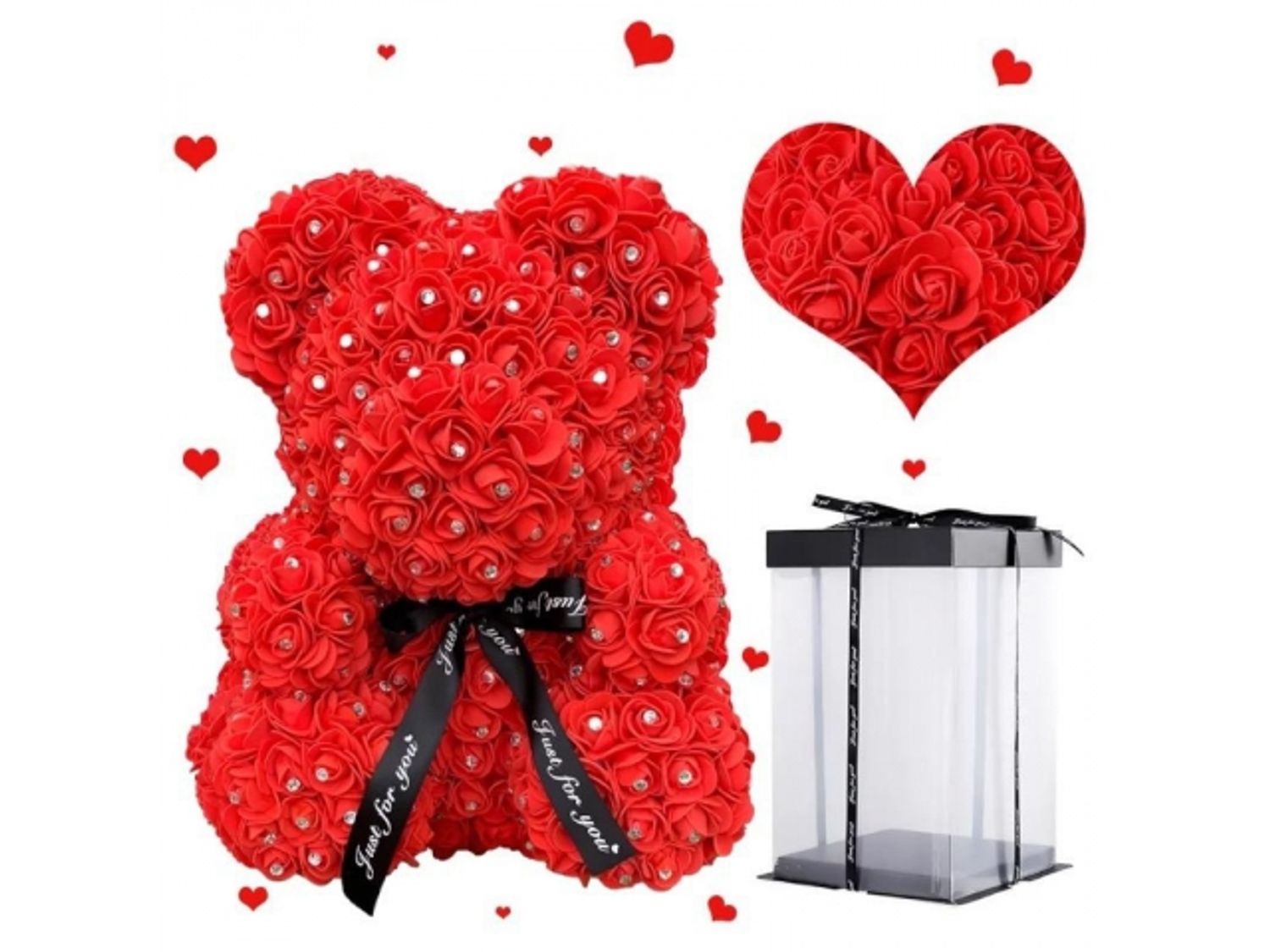 Oferowany przedmiot wykonany jest z około 600 piankowych róż, które ułożone są w kształt uroczego misia. Dzięki temu, że róże nigdy nie zwiędną, kompozycja będzie długo służyć jako piękna ozdoba