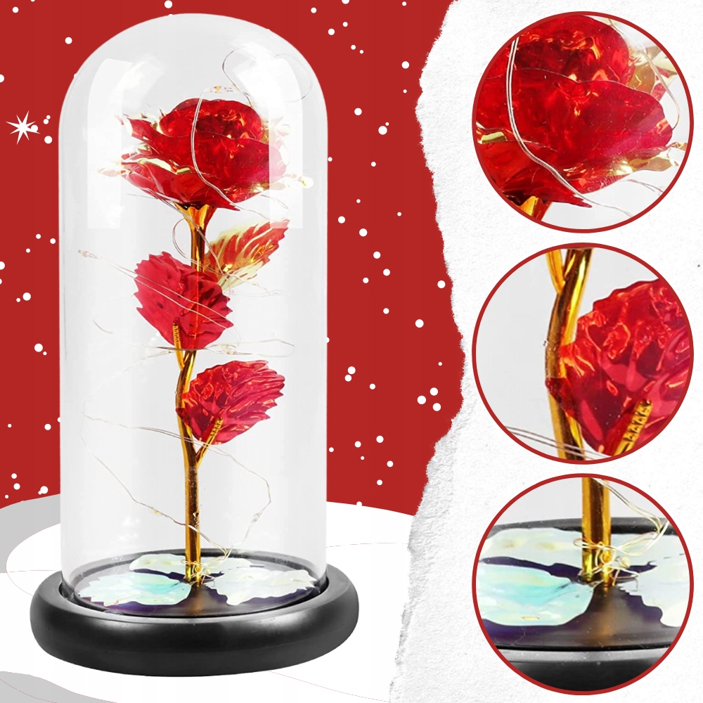Sztuczne płatki róż wyglądają na teksturowane i równomiernie zabarwione, okrągła podstawa jest stabilna, a przezroczysta szklana kopuła może zapobiegać gromadzeniu się kurzu przez kwiat.